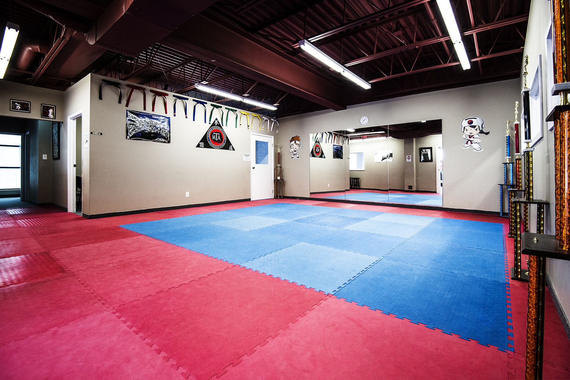 The training area is divided into two separate areas. The main dojang is where classes are held, and is equipped with punching/kicking bags, shields and hand held targets. In addition, large west-facing windows allow plenty of natural sunlight. The second dojang is where students can practice before or after classes, or any time the school is open. Both dojangs have full-length floor to ceiling mirrors so students can see their techniques better, as well as WTF approved mats for their training enjoyment.